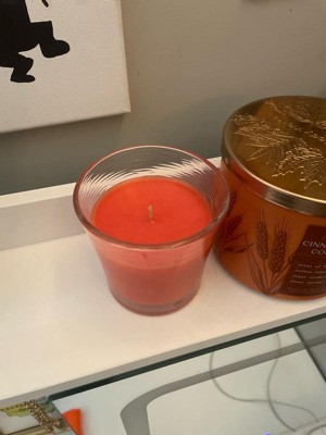 [This review was collected as part of a promotion.] A fall scented candle is the BEST candle. This has that pumpkin/ginger scent that radiates my open floorplan home. It's not overpowering, but it is strong enough to be noticed. It does tend to burn pretty quickly in my opinion...but coming as a 2pack is great. My only complain is i dont love color in candles - i prefer them to match my home decor as neutral. Personal issue/preference. Otherwise - so nice.