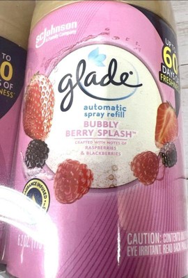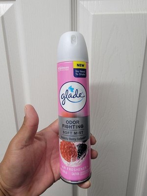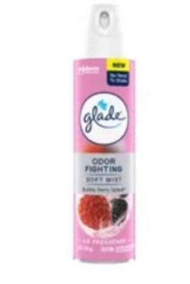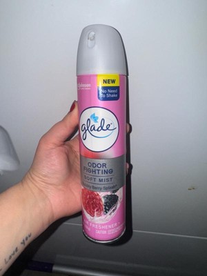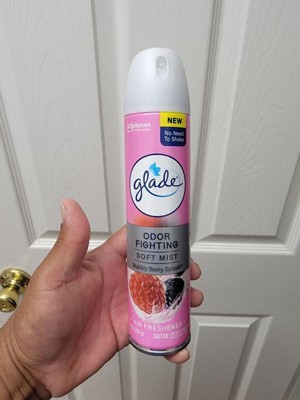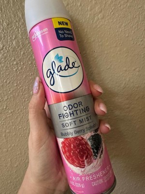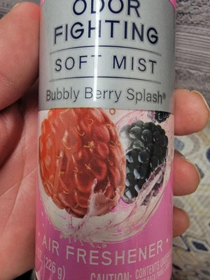 [This review was collected as part of a promotion.] This is a Glade air freshener in the Bubbly Berry Splash scent. It is an odor-fighting soft mist spray that does not require shaking before use. The packaging features a pink design with images of raspberries and blackberries, emphasizing its fruity and refreshing fragrance. The can contains 8 oz (226 g) of product.