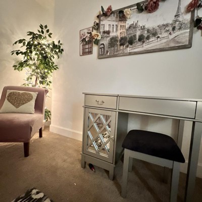 Glam Flip-up Mirror 1 Door Cabinet 1 Drawer Mirror and Wood Vanity and Stool Silver Lattice - Linon