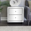 - •This wood accent table is covered in mirror, and comes with two drawers