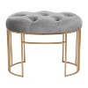 - •A gray and gold tufted accent bench with an oval seat and open-designed frame