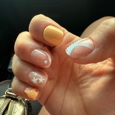 Escape to the coast with Glamnetic’s Sunny Shores Nail Set. These short almond nails feature different seashell designs on each finger — from solid orange shades to 3D starfish accents and floral details. Long-lasting and durable, these manis give you salon-quality nail art without salon prices.