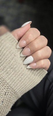 The Sweater Weather Nail Set features short almond nails with a sheer pink glossy base, accented by crisp glitter French tips. Cozy knit-inspired 3D detailing adds texture and charm, creating a chic, winter-ready mani that feels as luxe as your favorite holiday sweater.