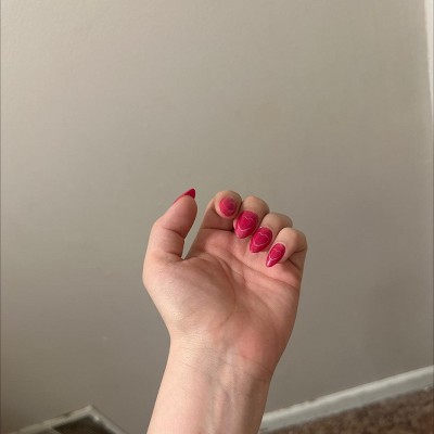 These nails are absolutely adorable. The vibrant pink color is bold and glossy, and the heart design adds the perfect playful touch without being too much.