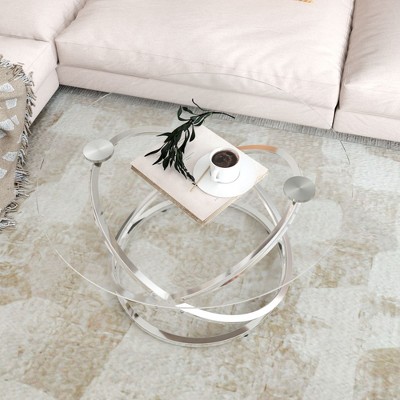 Product Name: Glass Coffee Table, Round Coffee Table with Geometric Silver Metal Frame