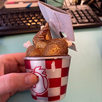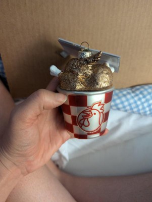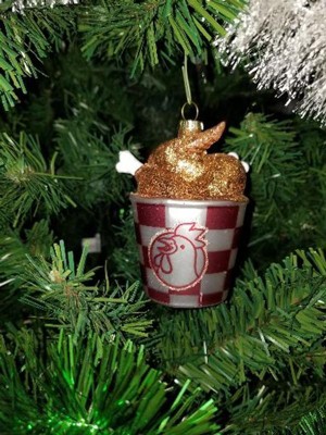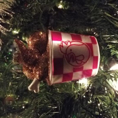 A late review for one of my favorite ornaments from Target. My mother gifted this to me 4 years ago. This looks even better in person with plenty of glitter on the chicken pieces and surprisingly well detailed painting from the bucket to the tip of the wing. The attention to detail is impressive at this price point and has held up over the years. Catches the tree lights perfectly. Add some fried chicken fun to your tree this year-you will be delighted everytime you look at it!