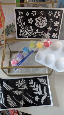 A: The kit includes a glass box, paintbrushes, stencils, acrylic paint pots, and an instruction sheet.