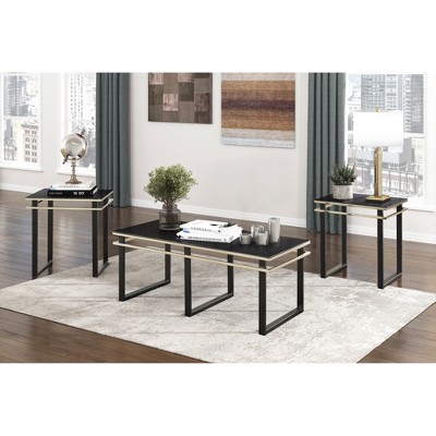 The convenient pairing of the Amara Collection¡¯s cocktail and two end tables provides an easy addition to your home¡¯s living room. The elegant contrast of the round black tempered glass tabletops, gold-hued banding, and metal legs creates a modern look while the round shape of the cocktail table and two end tables presents a classic profile, offering ample tabletop display space.
