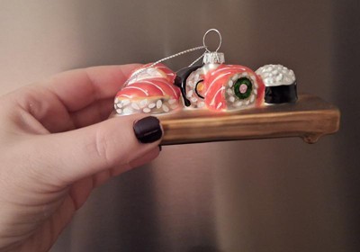 I’m so bummed - right after I took this picture I accidentally dropped the ornament and it shattered. I’ll have to get another because it’s so cute - all the little sushi details make it stand out. A fun addition to any tree!