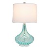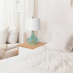 Illuminate your living space in style with this beautifully designed 24" glass table lamp. The light blue drapery-like glass and white fabric shade is the perfect blend to give your home a tasteful decor upgrade. It's the perfect piece to incorporate a beautiful, clean, modern style with your everyday lighting needs.