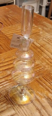 [This review was collected as part of a promotion.] I like the design of this candle holder but there are some minor details that didn't make me love it. The actual glass feels very thin and cheap which was disappointing. The color itself has an oil slick luminesce which takes away from the vintage aspect. Overall it's still a pretty nice piece to have in a room or bathroom for decor. I would not light a candle in this without someone supervising it for safety reasons. This candle handle was gifted to me for free through influenster.