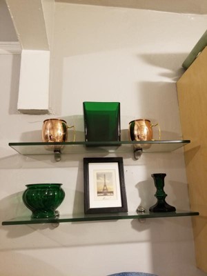 If there was a negative star, I'd use it. The shelf has a serious design flaw. Glass does not seat well on hard plastic surfaces (no non-skid rubber bumpers in this set!) nor can the flimsy brackets be adequately tightened without breaking or bending. Ultimately, the bracket bent and glass broke during the install. (FYI--I do a lot of DIY projects including hanging similar shelves in our previous house.) Also 'tempered' glass isn't supposed to break into tiny shards; that's part of the reason it's used. Not so for this shelf. I left the blood out of the pix but had to toss my anti-stress kitchen mat full of unremovable tiny shards.