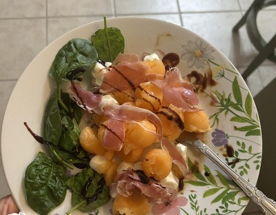 Delicious over a melon salad. Melon, mozzarella balls, prosciutto, and spinach.
