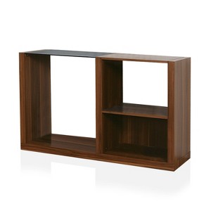 Gorgeous dark walnut finish replicated wood is interspersed with tempered black glass to bring a unique and engaging look to this modern console table. The rectangular table offers ample stylish studded with storage as it shows off a cubic silhouette that creates a divided space underneath that adds three shelves. Golden highlights add warmth and compelling style to this modern console table.