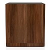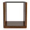 Gorgeous dark walnut finish replicated wood is interspersed with tempered black glass to bring a unique and engaging look to this modern end table. The square table offers ample stylish studded with storage as it shows off a cubic silhouette that creates a spacious lower shelf perfect for books or a basket. Golden highlights add warmth and compelling style to this modern end table.