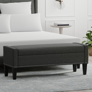 An inviting modern bench, this upholstered storage ottoman strikes a contemporary silhouette with truncated two-track arms and four solid wood square tapered legs. While a foam-filled cushion and arms provide added comfort and support. Just lift up the seat for hidden and functional storage - perfect to stash hats, gloves in an entryway or sheets and blankets in a bedroom. Available with and without nickel plated nailhead trim.