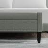 An inviting modern bench, this upholstered storage ottoman strikes a contemporary silhouette with truncated two-track arms and four solid wood square tapered legs. While a foam-filled cushion and arms provide added comfort and support. Just lift up the seat for hidden and functional storage - perfect to stash hats, gloves in an entryway or sheets and blankets in a bedroom. Available with and without nickel plated nailhead trim.