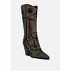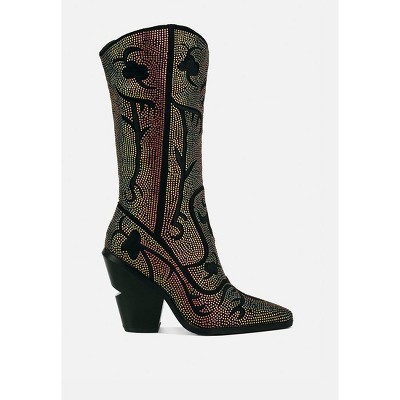 Take your West fashion up a notch with these intricately embellished rhinestone boots with embroidery detailing which just amplifies the overall look of the calf boots. The boots would make stunning transition shoes and add just the right amount of oomph to your fit! Upper Material: Shimmer Faux Suede Outer sole: Resin Closed Pointed Toe Rhinestones Embellishment Block Heel Embroidery Detail Calf Length Boots Lightly Cushioned Insoles SH4223