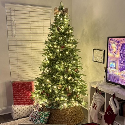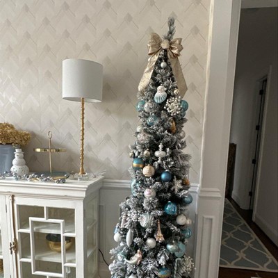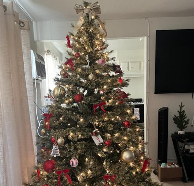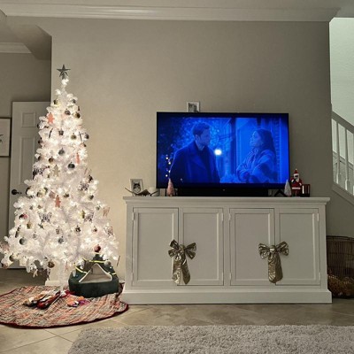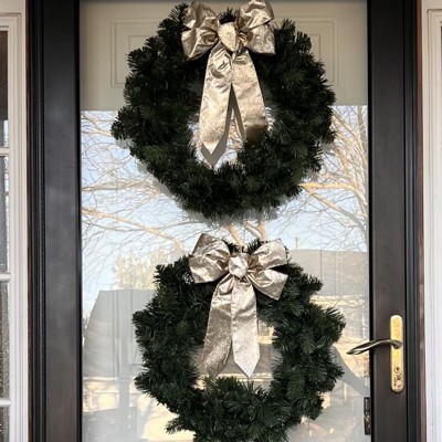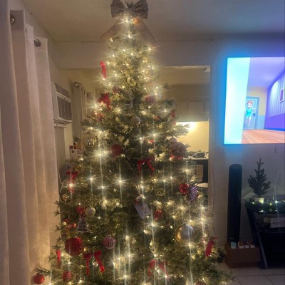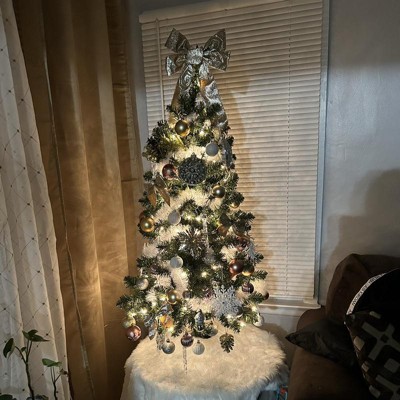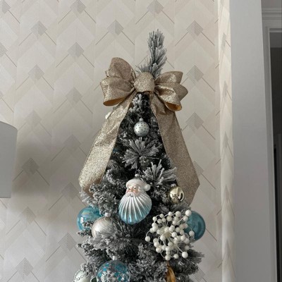 A: The bow adds a glamorous look with its gold hue and glitter, contrasting beautifully with green trees.