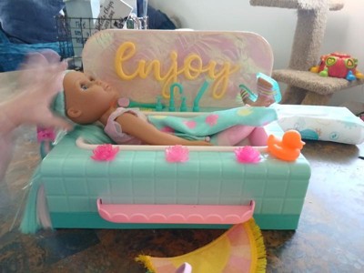 - Pastel Bathtub: Get Leia cozy and bubbled up in the bathtub, then slip on her face mask and relax! The easy snap-in shelf makes storage and play seamless.