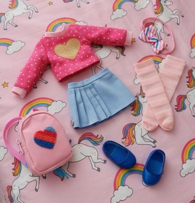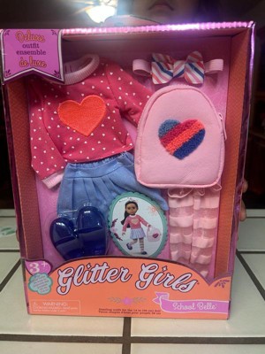 [This review was collected as part of a promotion.] The Glitter Girls School Belle outfit is absolutely adorable! The pink polka-dot sweater with the fluffy heart detail is so sweet, and it pairs perfectly with the pleated blue skirt. I love that it comes with a complete set of accessories, especially the matching backpack and the cute bow headband. It's a perfect, high-quality set for getting any doll ready for a fun day at school!