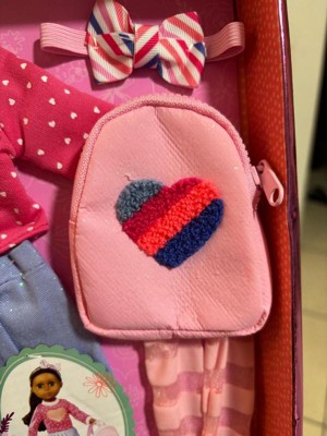 [This review was collected as part of a promotion.] Super cute doll outfit that can fit our generation or American Girl Dolls. Includes everything your doll will need to make a cute back to school outfit