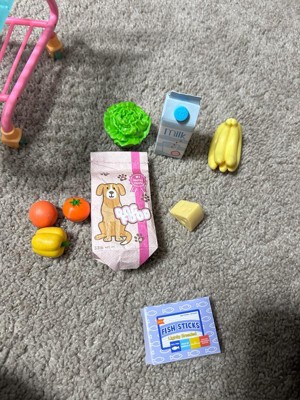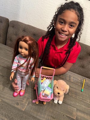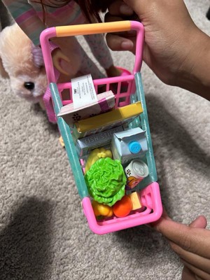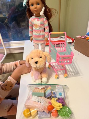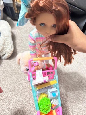 [This review was collected as part of a promotion.] Very cute set!! The doll is very cute with soft hair you can brush. The grocery pieces are the perfect size, not too big or too small. The dog is a cute stuffed animal. Comes with a cart to put food in and a dog on the leash! Such a cute doll set