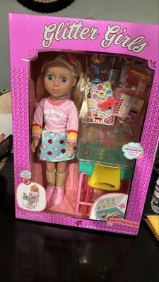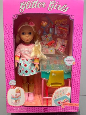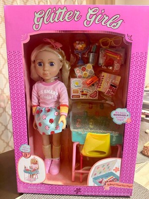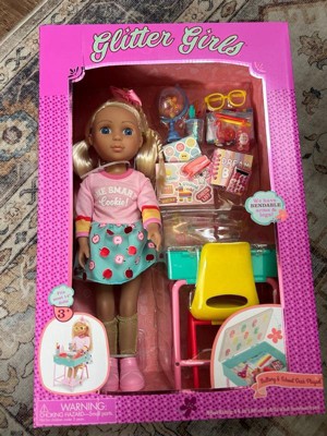 School rules with the Mallory & School Desk Playset from Glitter Girls! Every item in this 25-piece set wows with bright colors and glittering details. Mallory has bright blue eyes, soft blonde hair, and colorful doll clothes, perfect for acing every test. Want to change her look? No problem! Like all Glitter Girls clothes, Mallory’s outfit has easy-open closures, so kids can mix and match with other 14-inch dolls. Plus, she's bendable, so she can sit in her chair and raise her hand when she’s got a question! From a sparkling globe to a set of stickers, this school doll set has loads of fun accessories that boost imaginative play. When school’s over, open the desk and put everything inside! A fantastic kid's toy, the Mallory & School Desk Playset is recommended for kids 3 years and up.