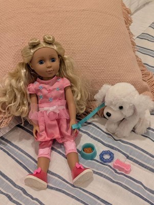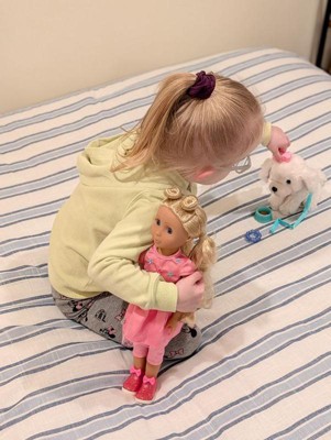 Every day is full of paw-some fun with Teri & Bibi! Teri is a 14-inch, posable Glitter Girls doll with long blond hair, soft lashes, and bright blue eyes. Undo her space buns and make a new hairstyle from scratch! Plus, her dazzling outfit has easy-open closures for endless play. Bend her arms and legs to strike a pose. Then, take Bibi for a romp at the park! Just clip on her leash and collar, and these two are ready to go. Bibi has soft, plushy white fur and is always up for adventure. This doll and plush pup set is compatible with all Glitter Girls dolls, playsets, and accessories, so kids can mix and match to their hearts’ content. Recommended for kids 3 years and up.