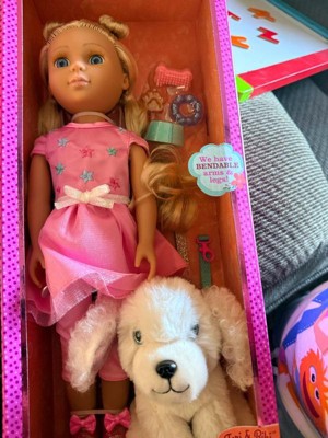 [This review was collected as part of a promotion.] My daughter has really enjoyed the glitter girls. We love that it comes with a furry friend and with fun little features, collar, leash, chew toy, and dog bowl. She liked that her arms and legs are bendable and the cute hairstyle she has. My daughter has played with her for hours. It was a win for our house.