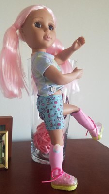 - 14-inch doll Nixie: beautiful brown eyes, long lashes, and soft, bright pink hair that’s fun to brush, style, and accessorize!