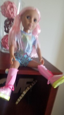 - Colorful fashion: wears a tie-dye, tie-front T-shirt with DREAM print, cute shorts with magical designs, knee-high socks, and glitter shoes; outfit has easy-open closures to quickly put on and remove.