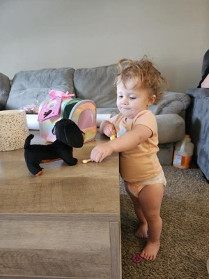 [This review was collected as part of a promotion.] My little girl really loves this play set. She was so excited when she saw that the case was glitter rainbow. She also loved seeing the little puppy and making it play with its chew toy. She also loves the little bone and brush. The entire thing was a big hit!