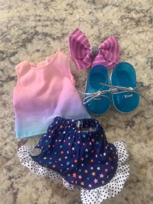 - Includes: A striped bow, a pink & blue ombre top, sparkly shoes, and star-studded shorts.