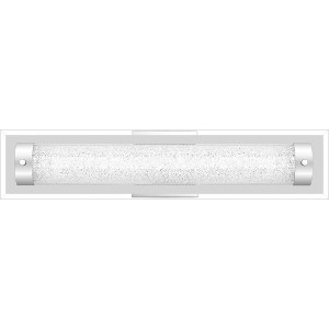 The Glitz bath bar lives up to its name. Featuring a glittering demilune mounted atop a thick panel of clear beveled glass, this whimsical charmer oozes luxury. A polished chrome backplate and endcaps complete the look.