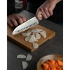 The Global 7-Inch Hollow Ground Santoku Knife is designed for precise slicing, chopping, and mincing. Made in Japan from Cromova 18 stainless steel, the blade is ice-tempered for exceptional sharpness and durability. The hollow-ground edge reduces sticking and drag, while the dimpled Global handle ensures a secure, comfortable grip. Ideal for vegetables, meats, and everyday prep.