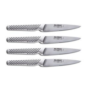The Global GSF-4023 4 Piece Steak Knife Set is crafted in Japan from high-quality Cromova 18 stainless steel for sharpness, strength, and precision. These compact steak knives feature ice-tempered blades, ergonomic handles, and a sleek one-piece design. Perfect for slicing through steak and other meats with ease and style.
