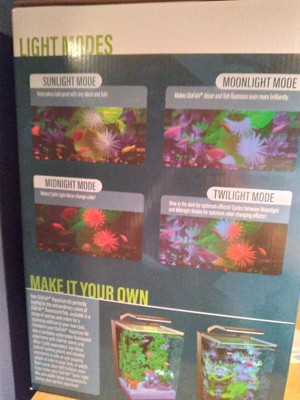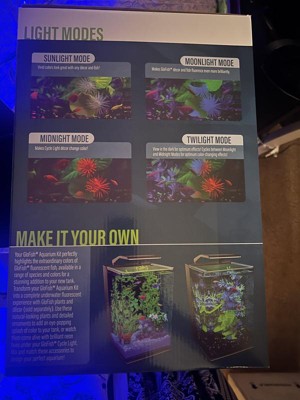 The GloFish Aquarium Kit LED Lighting System includes four modes: sunlight mode with all lights on for vivid colors that show off any décor and fish; moonlight mode with blue lights; midnight mode with black lights on to highlight GloFish fluorescent fish and décor; and twilight mode, with blue and black light fade.