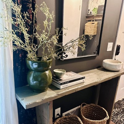 It’s a lovely dark olive color, and matches my Hearth & Hand glass vases from a couple years ago. The inside of the vase is the same color as the outside, which is nice. Solid, heavy, and worth every penny.