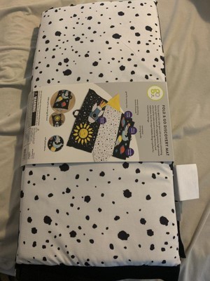 What a fun tummy time toy! This mat can either lay completely flat, fold up into a triangular pillow, or fold like a book. It has fun crinkle paper spots as well as squeaker spots. The squeaker noises are a bit tough for my little one to push currently but with assistance she will gain strength and learn to do it herself.