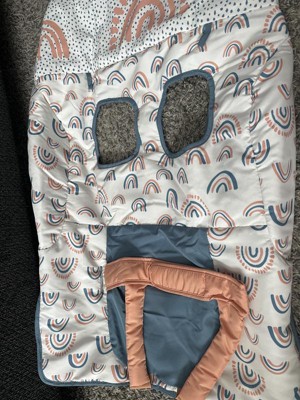 Adorable pattern, with nuetral tones. Cozy and plush in the areas that matter. Easy to add onto any shopping cart or high chair keeping baby safe from dirt and germs. I love having a seperate strap to hold my sitting baby in place while providing comfort. When I'm done it folds in to a tote so I can have ready for next use.