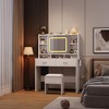 - [Practical Design with Storage] Sleek design with bright color. Includes a spacious tabletop, two drawers, and three-tier shelves for organized cosmetics and accessories. Comes with a cushioned stool.