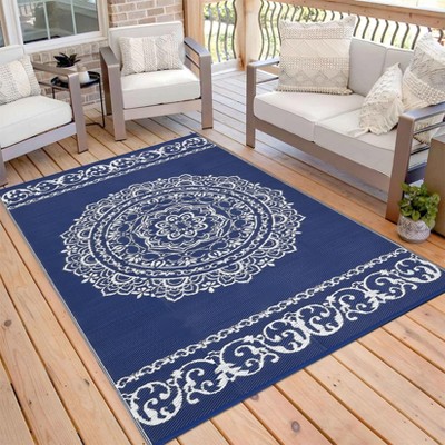 GOCAPTAIN 8x10ft Outdoor Waterproof Reversible Rug, Lightweight Plastic Straw Mat for Patio, RV, Deck, Picnic, Beach, Trellis Navy/White