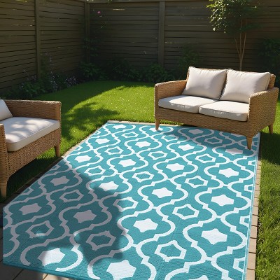 GOCAPTAIN 9x12ft Outdoor Reversible Rug, Waterproof Quick-Dry Plastic Straw Mat for Patio, Deck, Porch, Balcony, Teal/White(Flower)