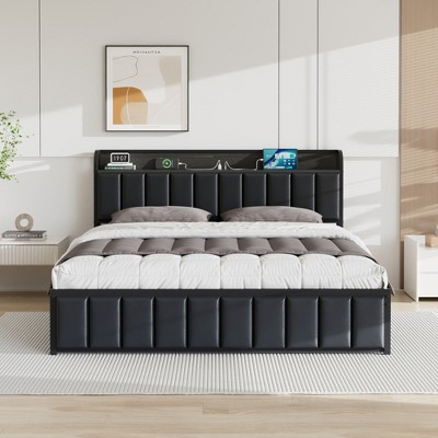 VECELO Twin/Full/Queen Size Metal Frame Platform Bed Frame with Storage Charging Station, Black/Gray