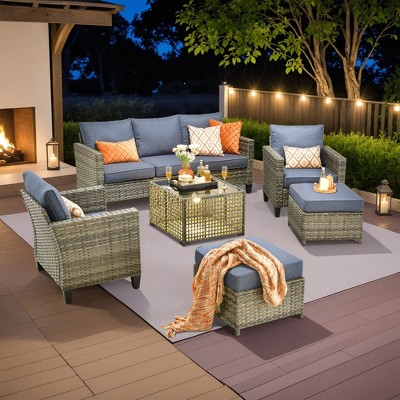GODEER 5pc Wicker Outdoor Conversation Set Sand: Steel Frame, Polyester Cushions, Includes Coffee Table