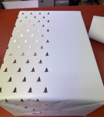 Love target gift wrap! Great quality, and I appreciate different choices than what other stores or what online offers. This paper is white (slightly glossy) with GLOSSED FOIL GOLD TREES on it. Both receivers of my gifts commented on this paper.)
