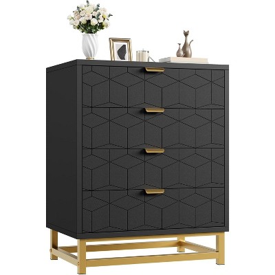 Elegant & Stylish: Delicate gold metal legs and handles combined with modern engraving patterns add appealing detail to this drawer dresser, and easily match any decoration style to add unique charm to your space.Spacious Storage: Modern dresser for bedroom has 4 large drawers and can meet your all storage needs, It can better help you sort store, and keep all of your items and accessories organized.Multipurpose Usage: This drawer dresser just like an ornament is exquisite and beautiful. Modern style with simple wood texture perfect for multiple occasions like office, bedroom, and kitchen. You can use it as a clothing organizer/lingerie dresser or an accent storage cabinet for the living room.Durable Sturdy: Eco-friendly MDF board is waterproof and scratch-proof, and has good durability. 4 high-quality metal legs and anti-tip device enhance stability and ensure the safety of your family, meeting your pursuit of quality.Easy Assembled: The package includes clear instructions and marked parts so that you can quickly install this storage chest. Please contact us if you have any questions.