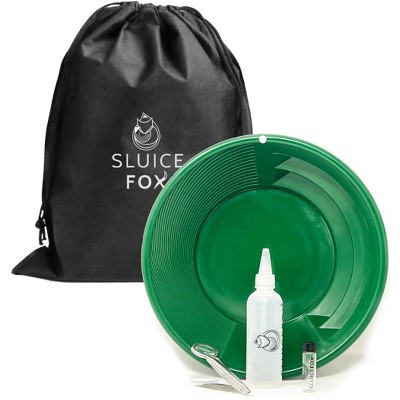 Starter kit for gold prospecting includes one small VR gold pan, one snifter bottle, one glass vial, and one stainless steel tweezer with magnifying glass. VR gold pans feature a deep 45 degree side wall, larger pan floor, aggressive large riffle set, and patented varying riffle (VR) surface texture small riffle set, allowing for greater control in separating gold fines and smaller flakes. VR gold pans hold and process a higher volume of material in each pan when compared to the "standard" gold pans you might find online or at the gas station. A 9" VR gold pan for instance, has a slightly larger capacity than a "standard" 10" gold pan. An 11" VR gold pan has a slightly larger capacity than a "standard" 12" gold pan.The snifter bottle by Sluice Fox features a superior suction nozzle to make quick work in your separated gold collection.5ml glass storage vial with screw-on plastic capCombination tweezer and magnifier tool allows you to use these two tools simultaneously while keeping the other hand on your pan. Made of stainless steel for years of use at the river.