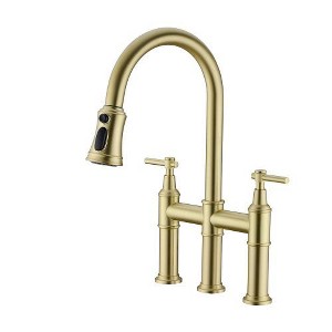 The Spot-Resistant Bridge Kitchen Faucet with Pull-Down Sprayhead is a sleek and functional addition to any kitchen, featuring a design that resists fingerprints and water spots. With a convenient pull-down sprayhead for versatile cleaning, this faucet spans the kitchen sink with a graceful bridge-style arc, offering both traditional charm and modern convenience. Its easy-to-clean surface and durable construction ensure a lasting, spot-free shine.